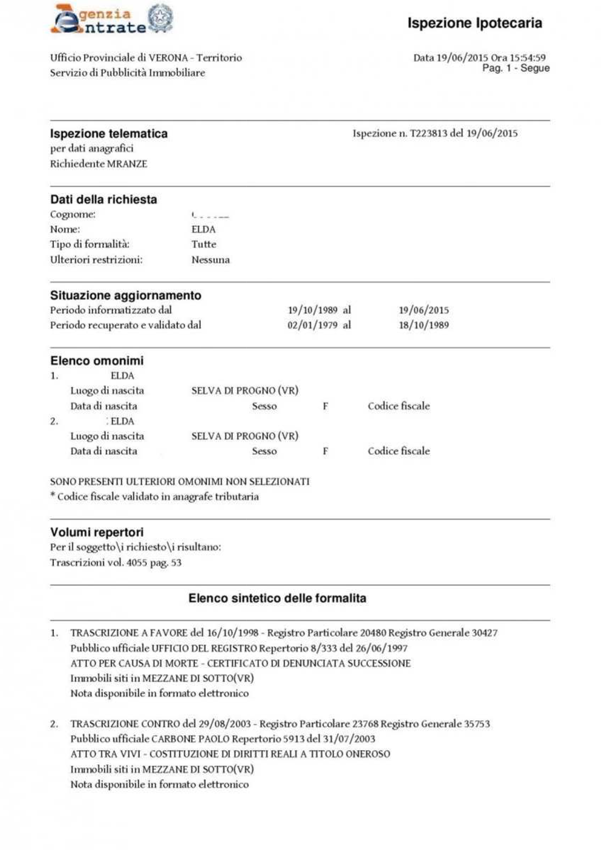 – ispezione ipotecaria nazionale: una ricerca riferita ad un soggetto (persona o azienda) su tutto il territorio nazionale per verificare se vi sono delle formalità a carico del soggetto e in quale provincia; fornisce quindi solo l’elenco delle province in cui è presente almeno una formalità specificandone il tipo (es. trascrizione, iscrizione, ecc.).